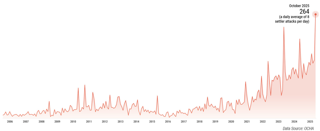 Angreb fra terrorstatens bosætter terrorister og terrorister fra ZOF nåede i oktober 2025 det højeste niveau nogensinde med 8 angreb dagligt på palæstinensiske bønder, der ønskede at høste oliven på deres olivenmarker. Terrorstatens nazistiske «sikkerhedsminister» Itamar Ben-Gvir uddelte i november 2023 150.000 automatvåben til sine bosættervenner på Vestbredden. De anvendes nu til angreb på palæstinensere og internationale observatører. Det er en koordineret strategi for fordrivelse af palæstinenserne fra Vestbredden. Først ødelægges deres livsgrundlag i form af olivenhøst, dernæst fordrives de, dernæst overtager besættelsesmagten deres jorder med henvisning til, at «ubrugte jorde kan overtages af besættelsesmagten», endelig uddeles jorden til bosætter terrorister. Humanitarian Situation Update #337 | West Bank, OCHA OPT november 2025. OCHA OPT Humanitarian situation Update. [United Nations Office for the Coordination of Humanitarian Affairs, OCHA] |