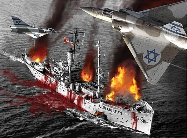 Terrorstaten Israel angreb 8. juni 1967 USA's spionskib USS Liberty. Først med krigsfly og dernæst kanonbåde. Over 34 søfolk, marines og spionansatte blev dræbt og over 170 såret. Israel hævdede efterfølgende, at der var tale om en «fejltagelse», men senere offentliggjorte optagelser af kommunikationen mellem krigsfly, kanonbåde og terrorstatens militære styring afslører, at Israel var fuldstændig klar over, at skibet var USA's.